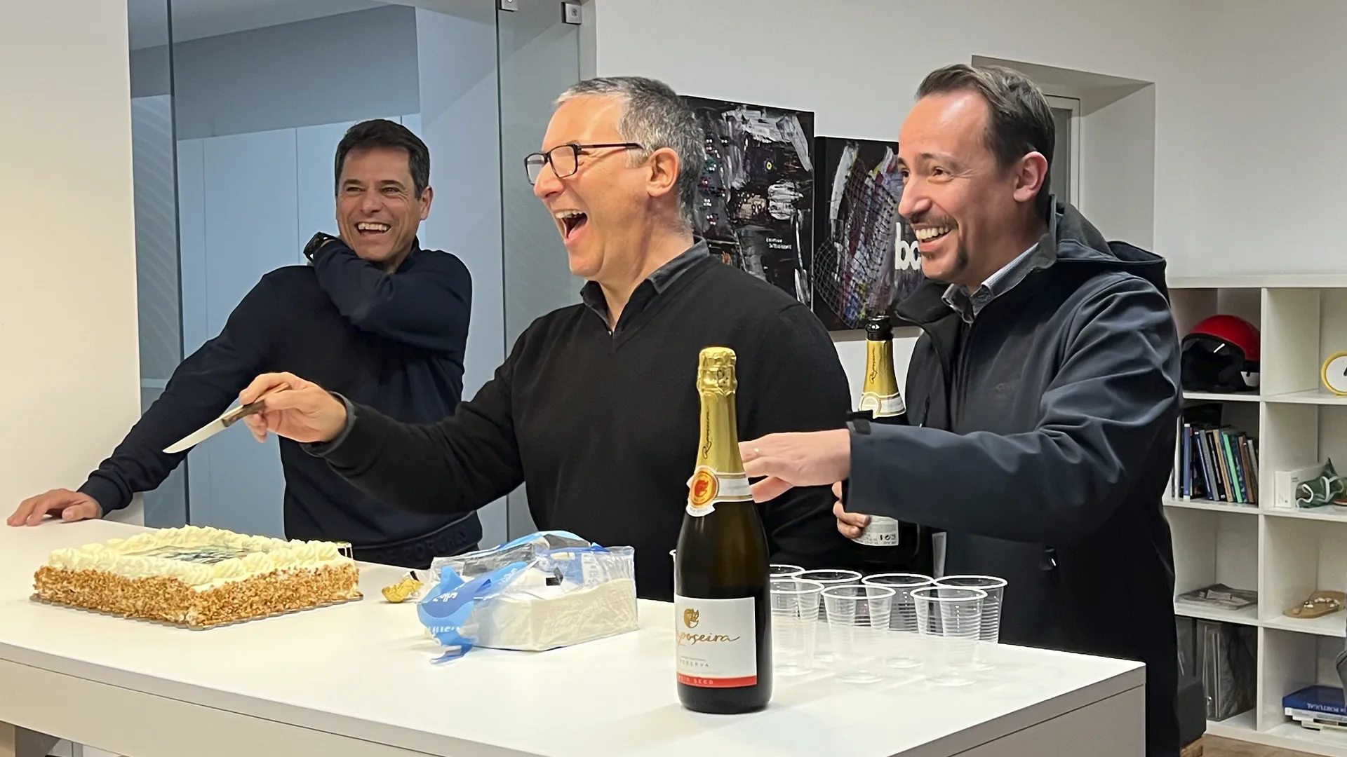 Founders laughing while cutting a celebration cake on an office counter, with champagne bottles and plastic cups prepared for a toast.