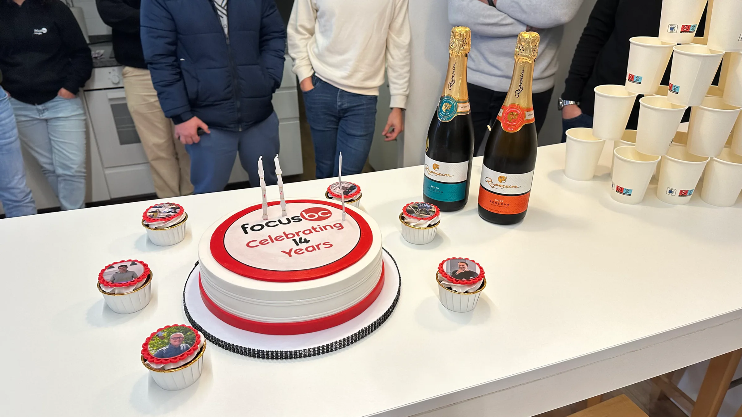 A white table with a “Focus BC – Celebrating 14 Years” cake, photo cupcakes, two bottles of sparkling wine, stacked paper cups, and team members standing behin…