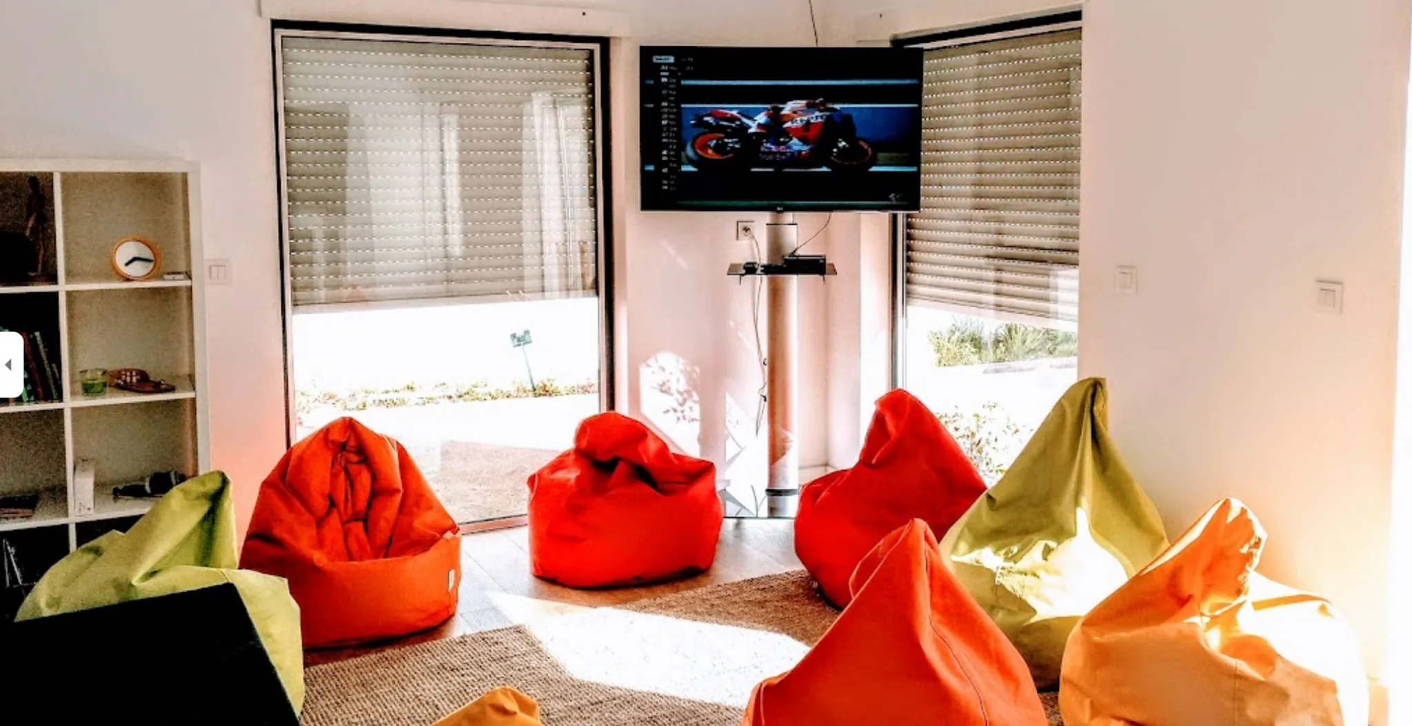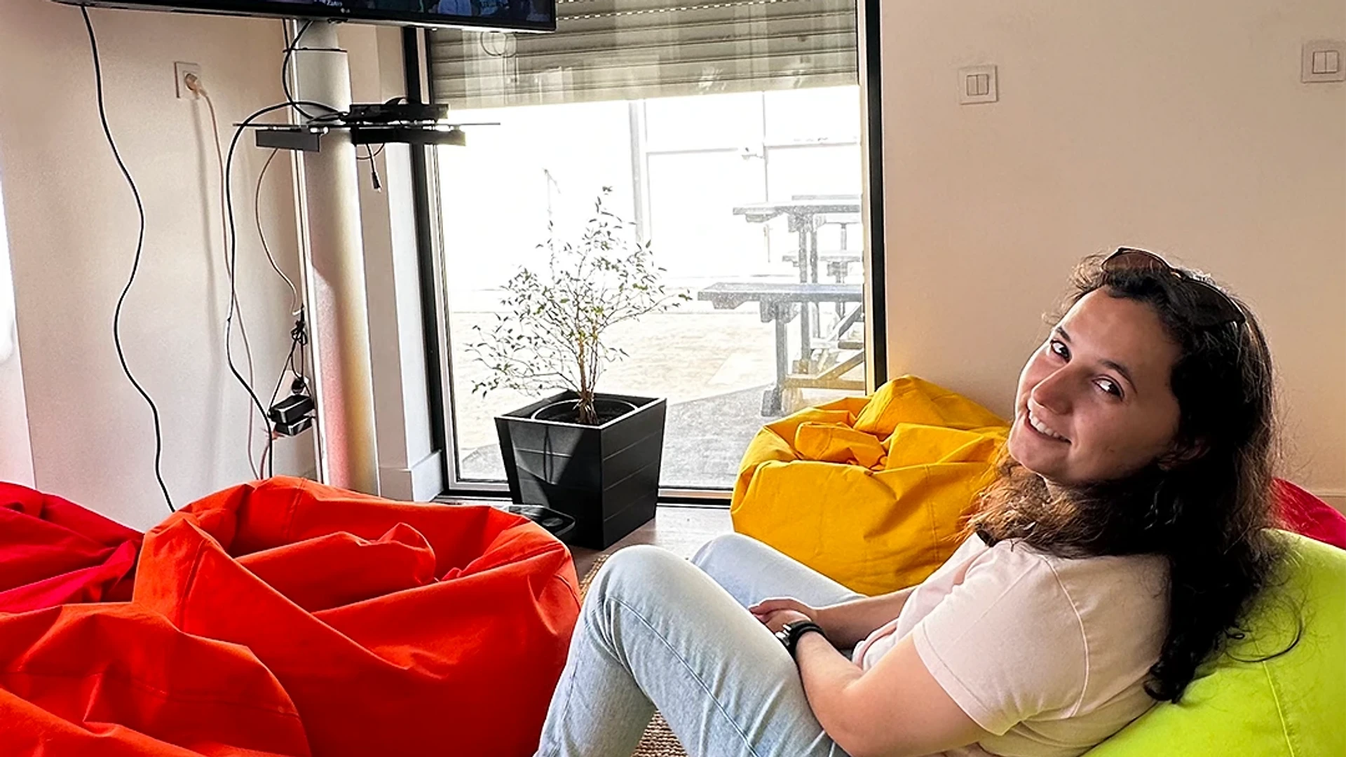 Relaxed lounge area with colorful bean bag chairs arranged in a circle, facing a wall-mounted TV in a bright room with large windows.