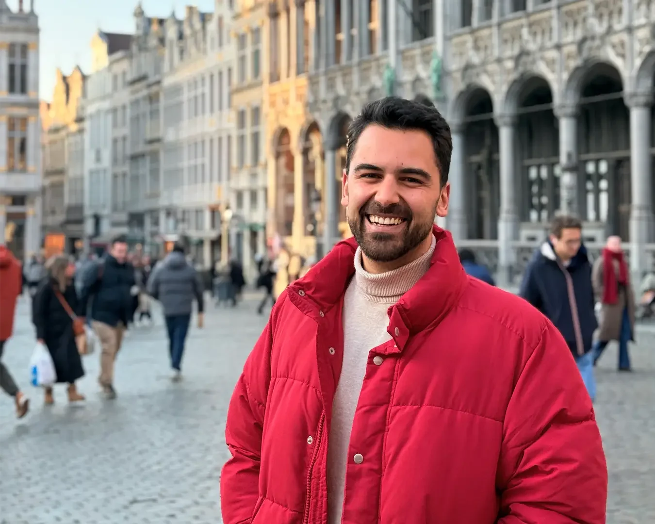 Guilherme smiling in a large city square, wearing a bright red puffer jacket over a beige turtleneck. The background shows historic European buildings and peop…