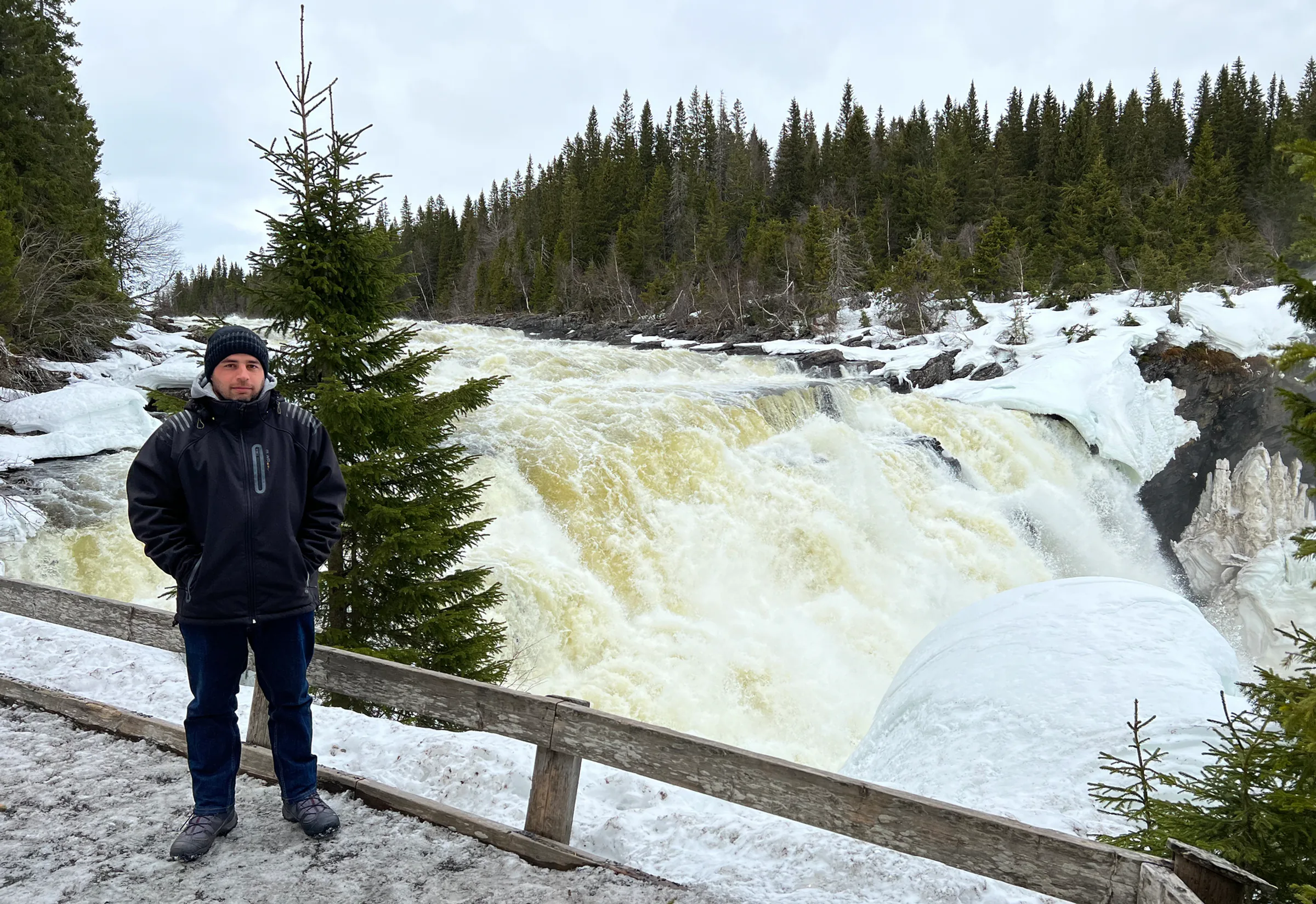 Man wearing a black jacket and knit hat standing by a wooden railing in front of a powerful waterfall. Snow and ice surround the rushing water, and a dense for…