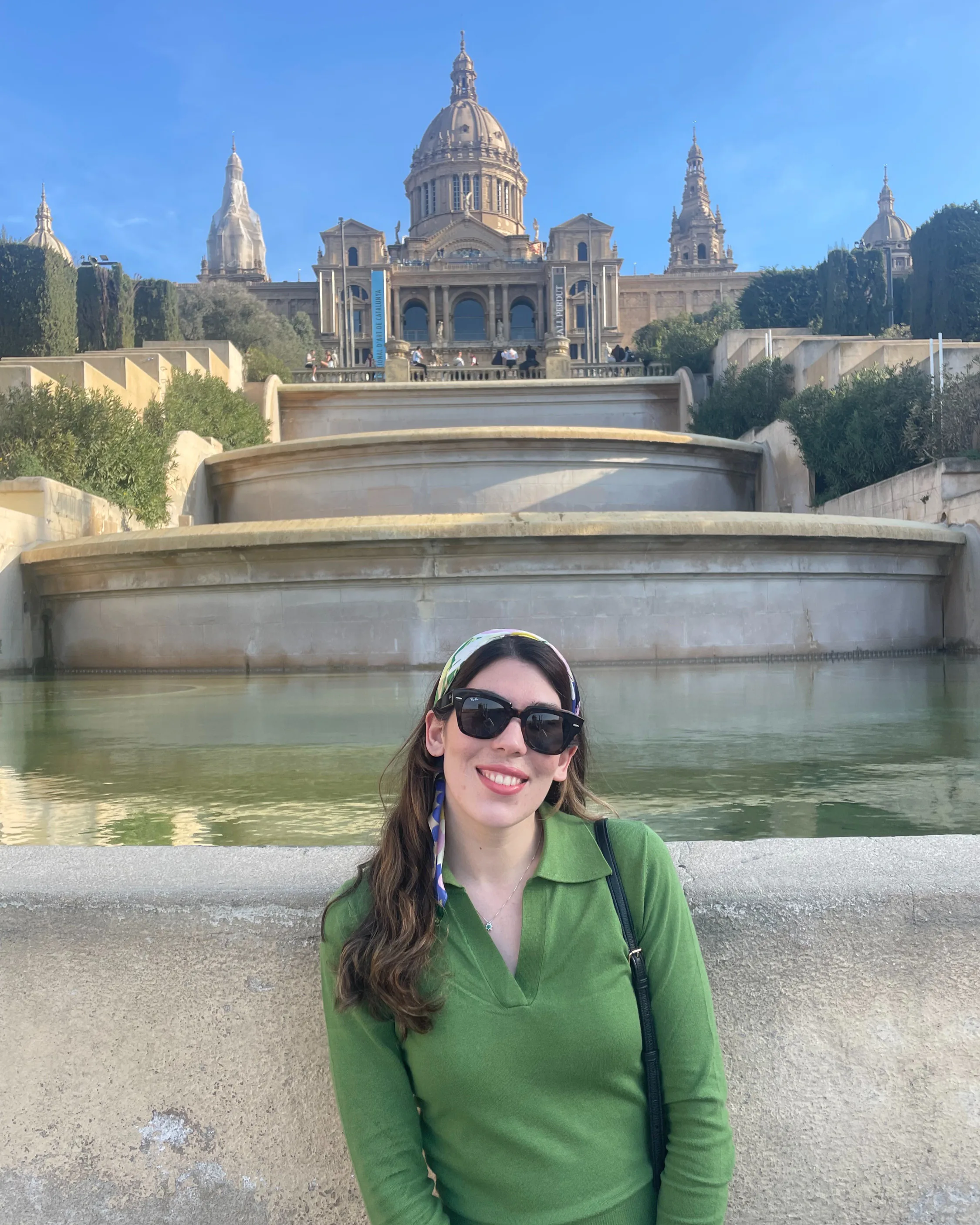 Rita standing on a stone bridge by a calm river, smiling at the camera. She is wearing a denim jacket over a black top and white trousers, with a light-colored…