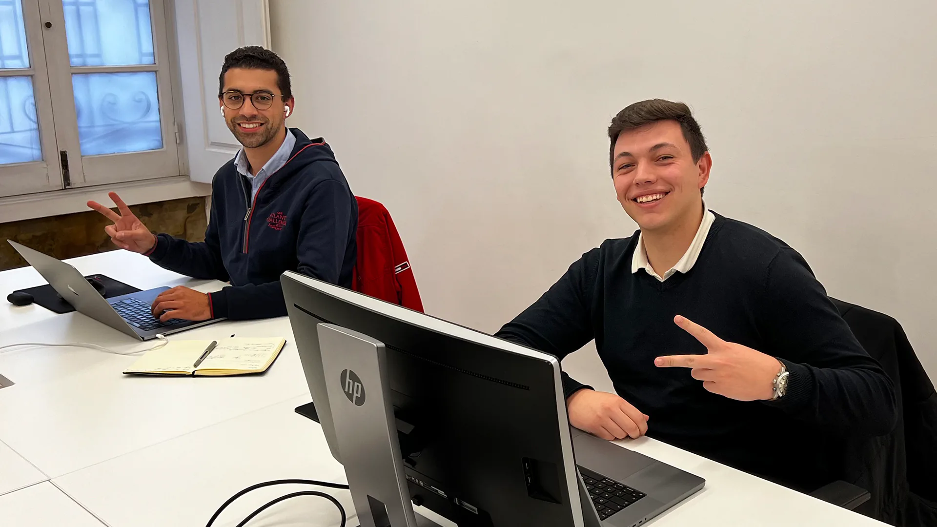 Two young professionals smiling and making peace signs while working on laptops at a desk in a bright office.