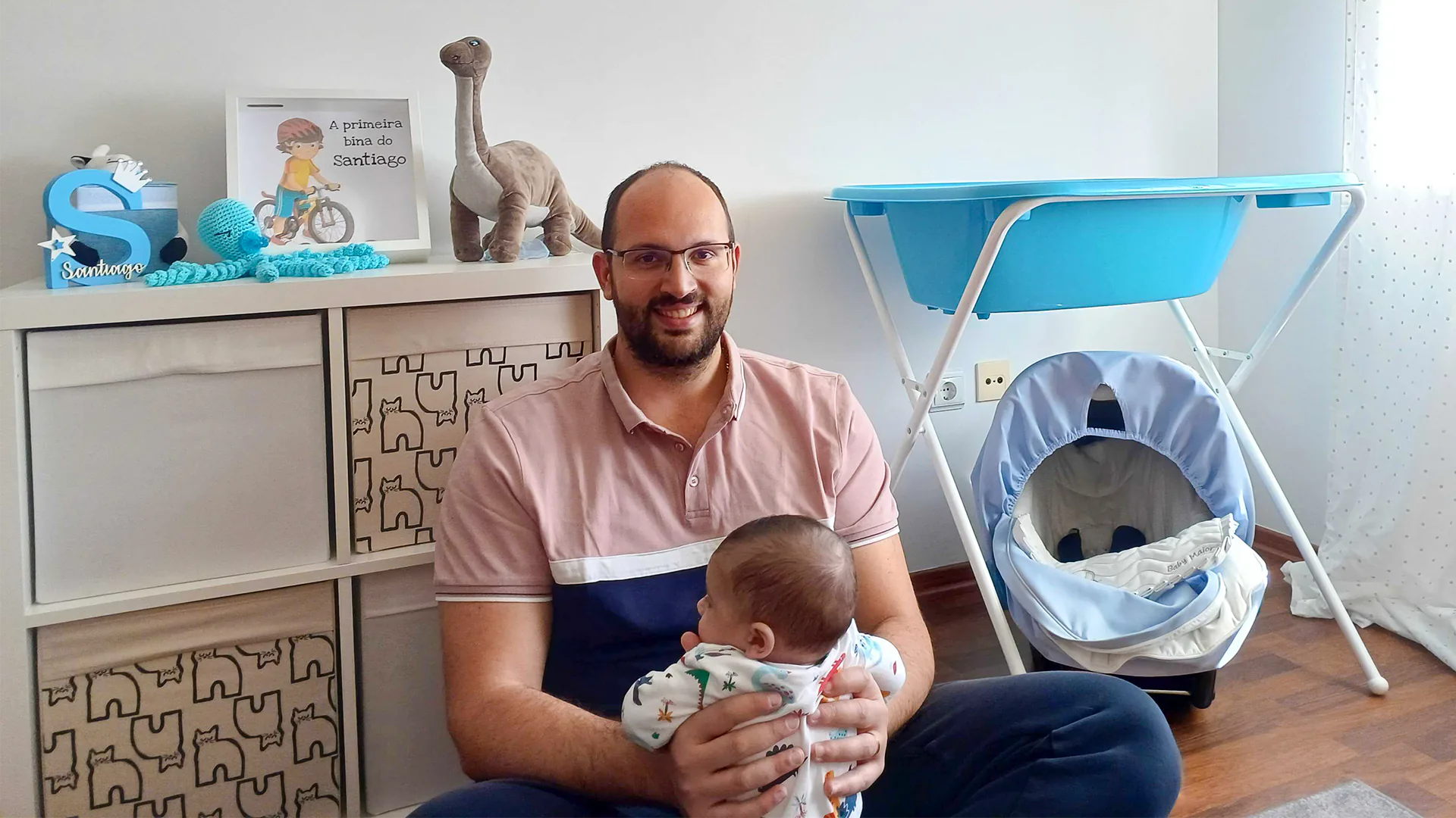 Smiling father sitting on the floor holding his baby in a cozy nursery, with a changing table, baby seat, and decorative items in the background.