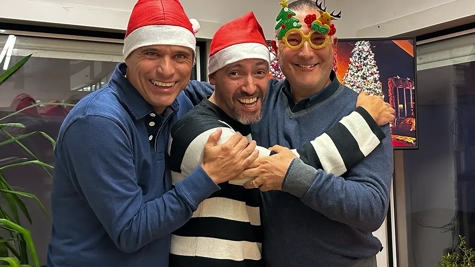 Three founders of Focus BC - Vasco, Sandro, and Nuno — standing together and smiling during a Christmas celebration. Vasco and Sandro wear Santa hats, while Nu…