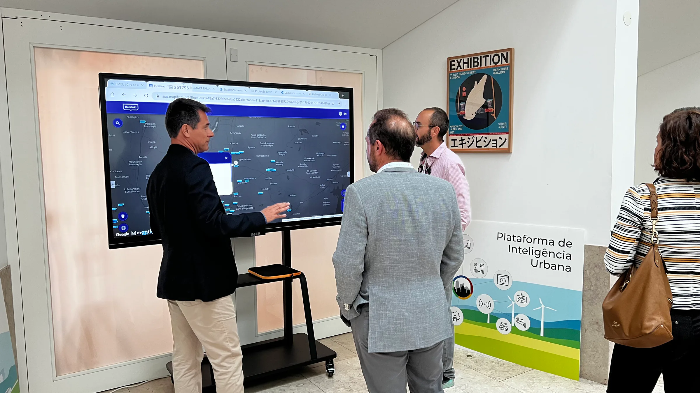 A professional presenting an urban intelligence platform on a large interactive screen to three attendees in a modern office setting, with a display board read…