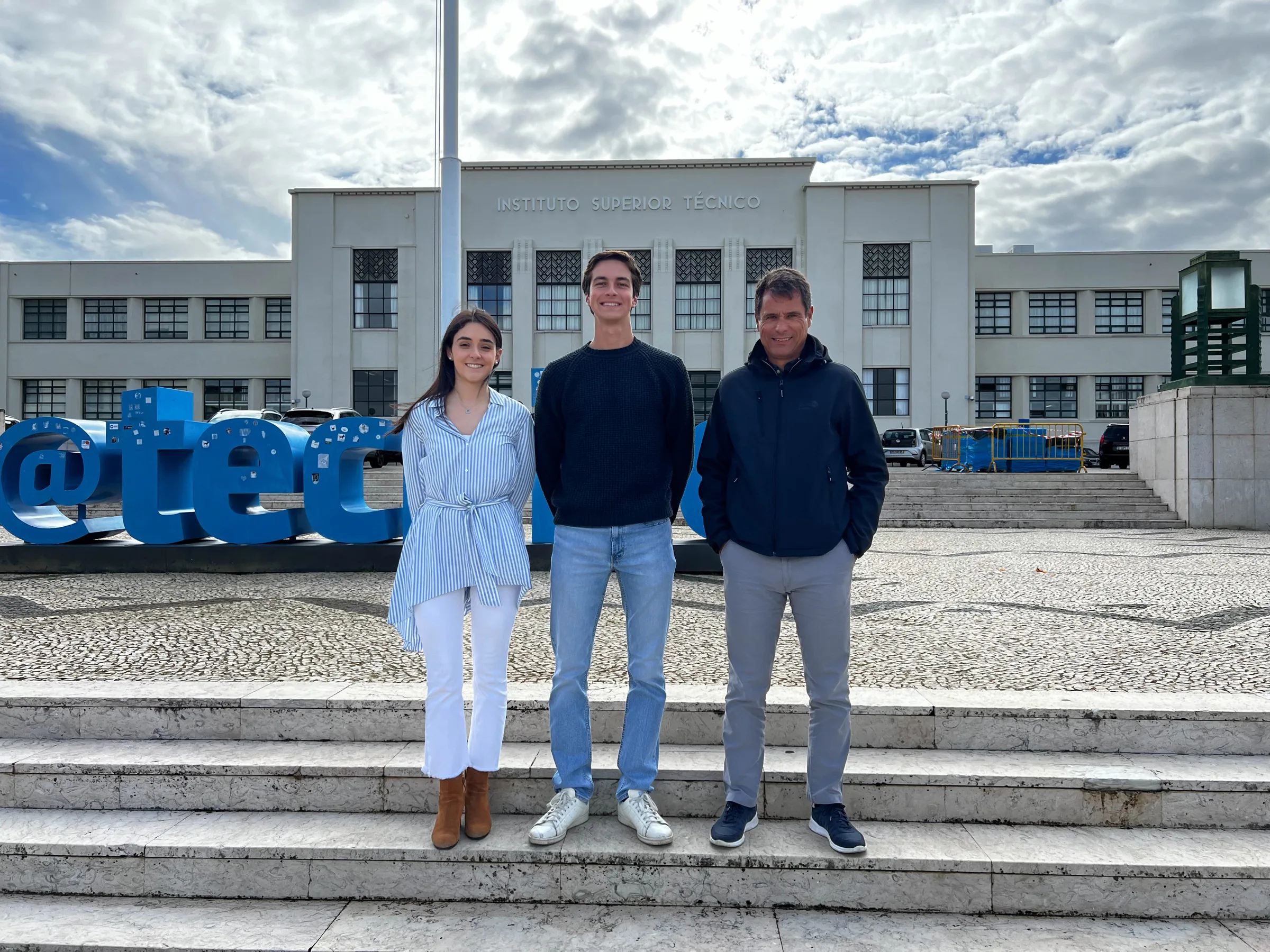 Nuno, Sandro and Vasco standing outdoors in bright sunlight beside a white wall and leafy green trees.