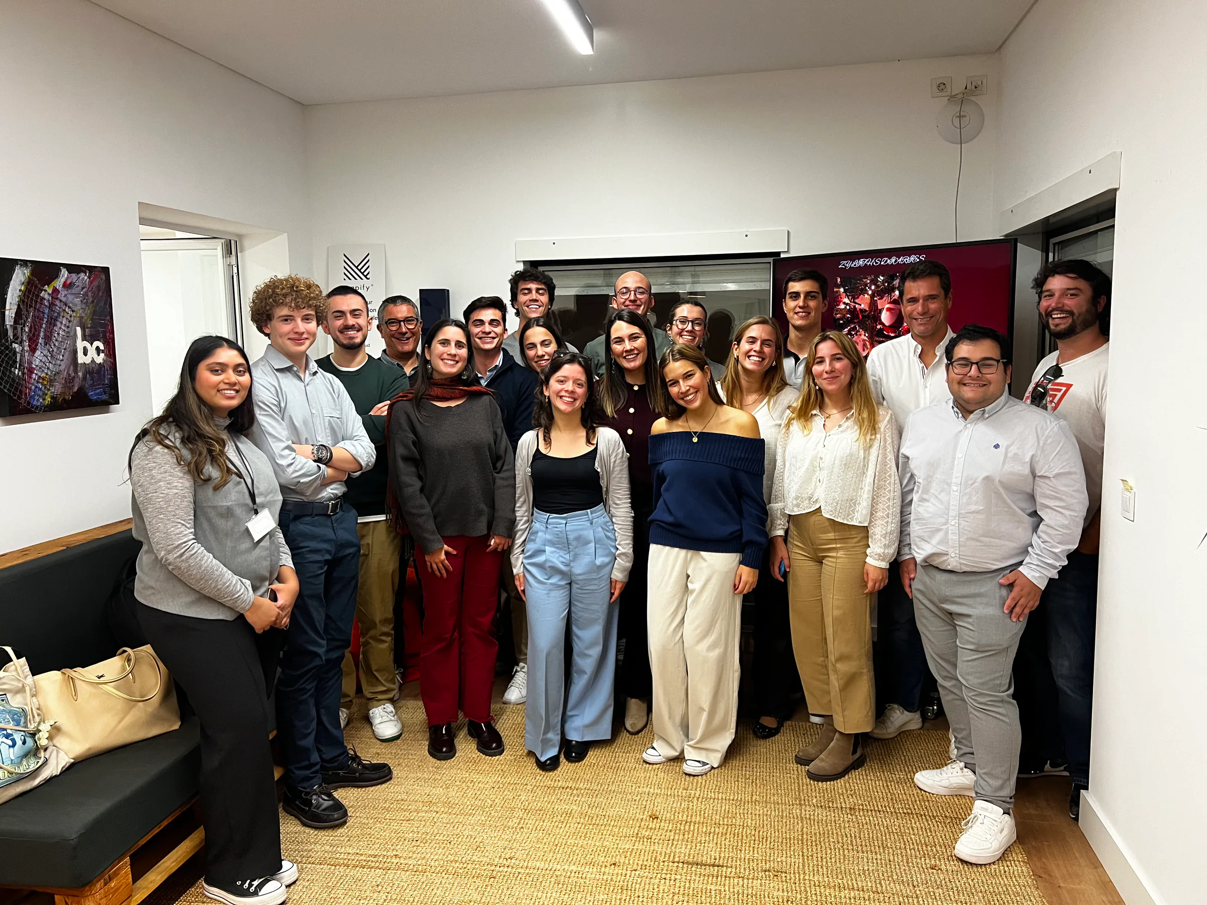 Group photo of Focus BC team members and Junitec students standing together and smiling inside the Focus BC office during a company open day visit.