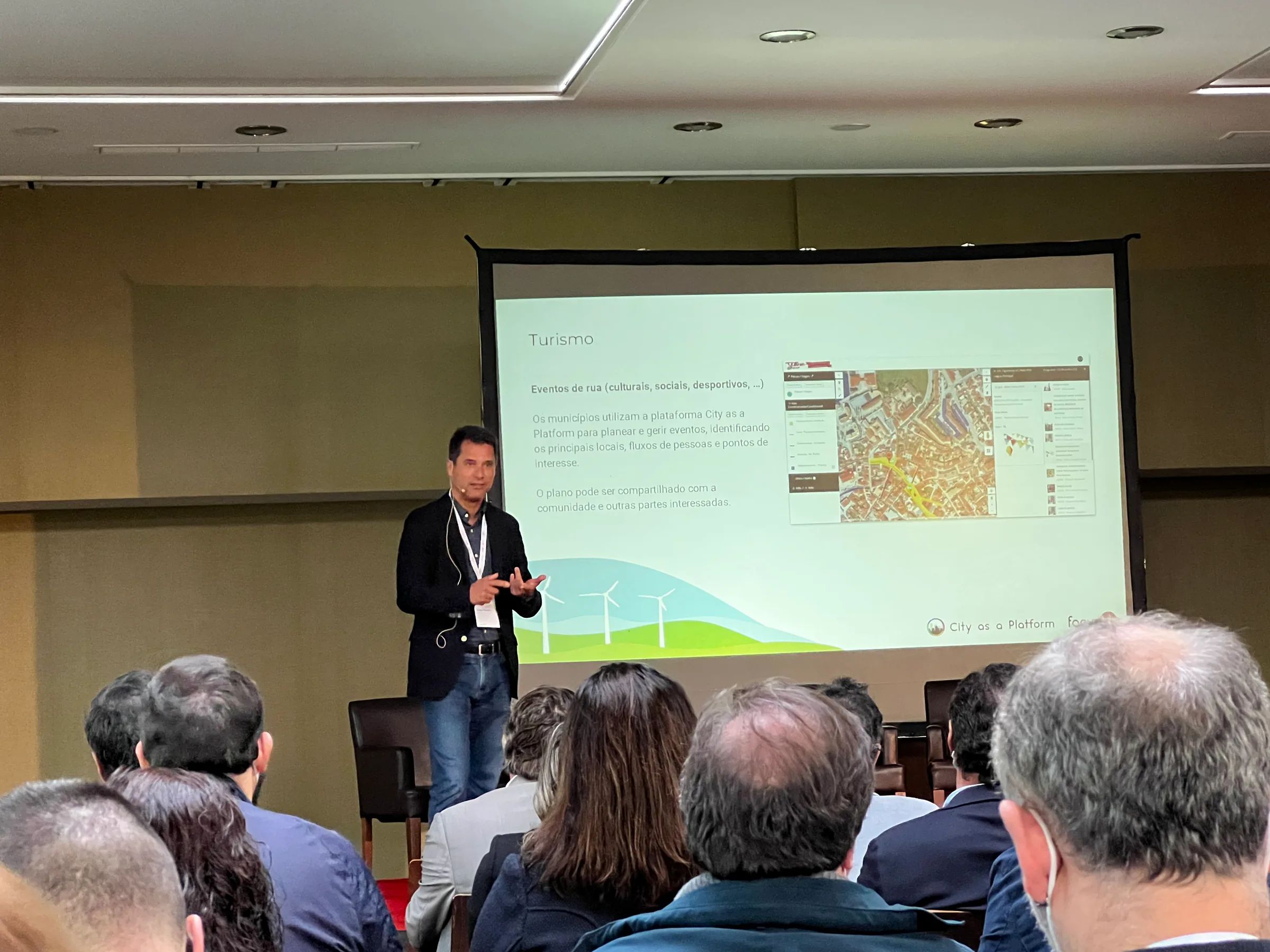 Speaker presenting Focus BC’s urban platform on stage, with a slide reading “focusbc – sentir, comunicar e gerir a sua cidade” projected behind him.