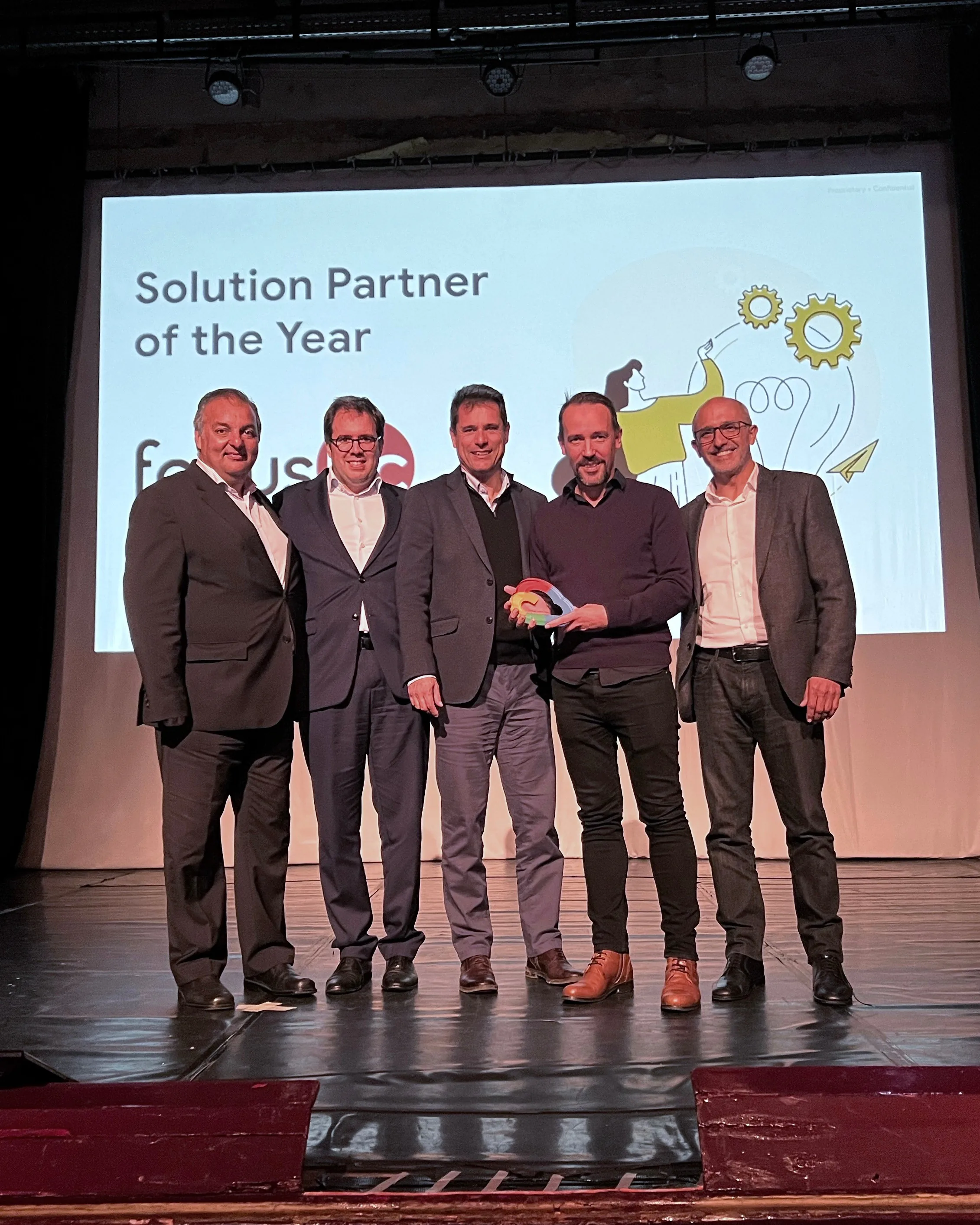 Exterior of the Focus BC office with Google Cloud branding on a white wall, glass entrance doors, and a “PME Líder ’21” award badge displayed in the top corner.