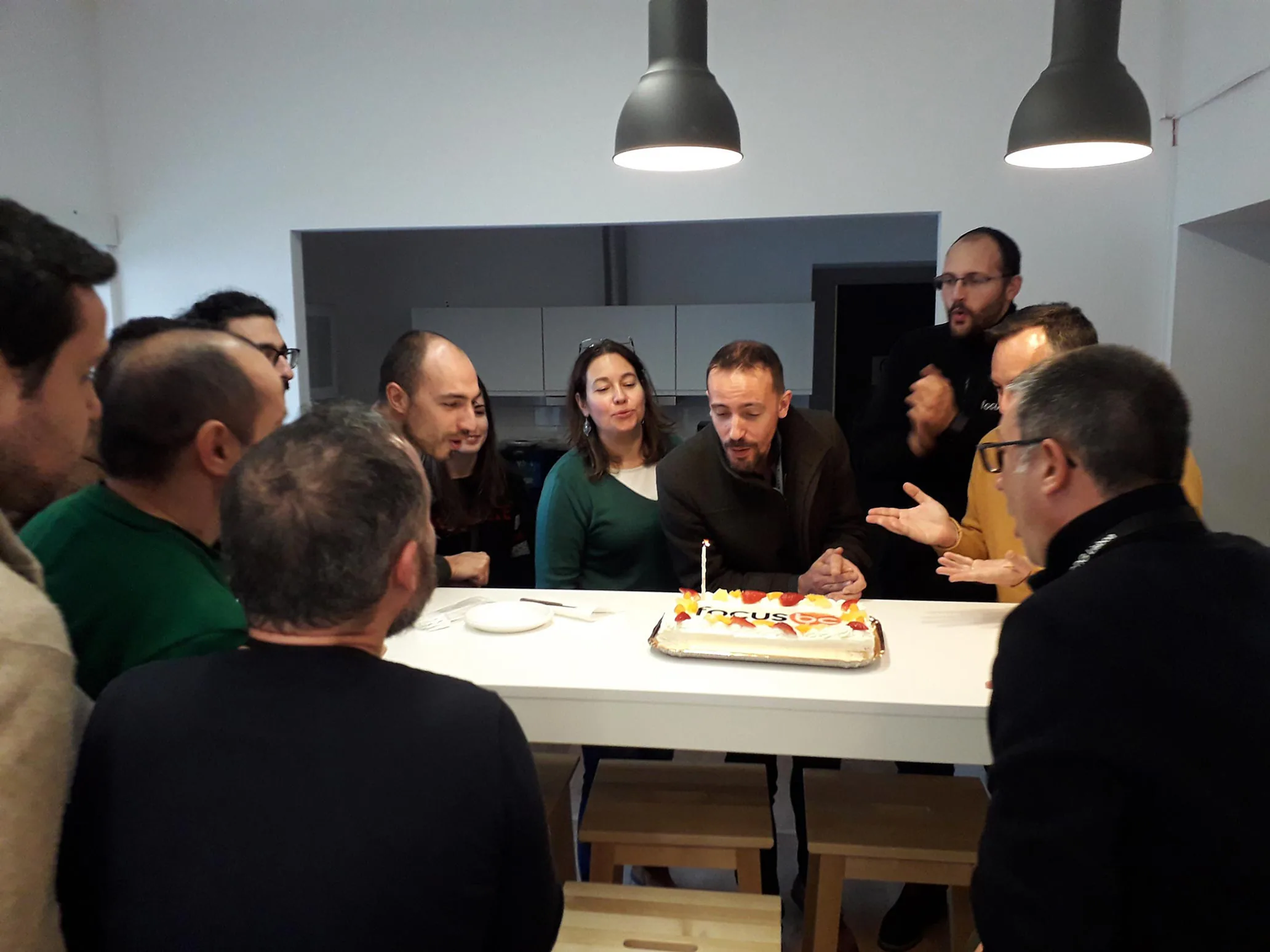 Team gathered around a table celebrating with a birthday cake featuring the Focus BC logo, as a colleague blows out a candle while others clap and smile.