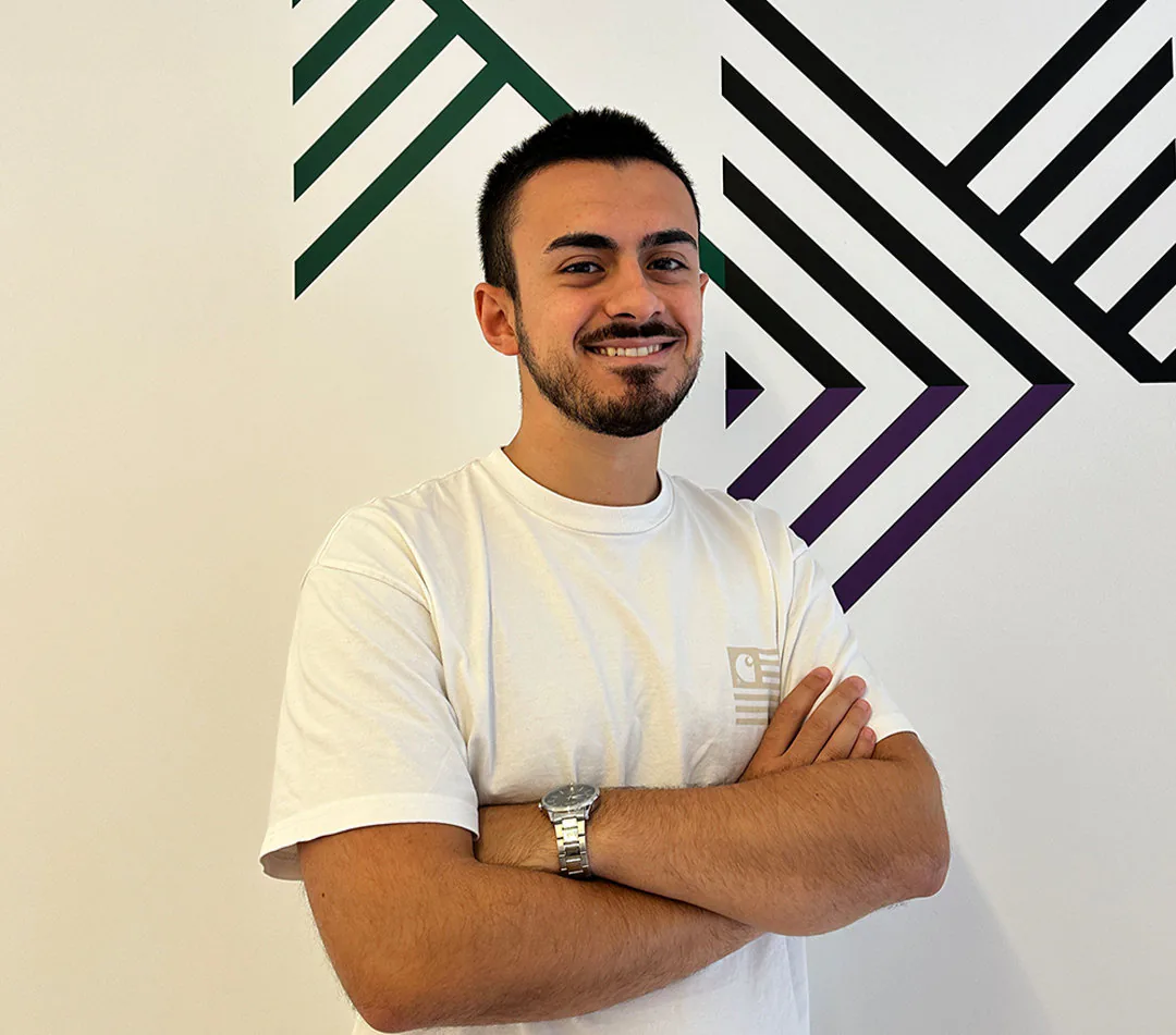 Tomás, with short dark hair and a trimmed beard smiling with arms crossed, wearing a white t-shirt and silver watch, standing in front of a wall with geometric…