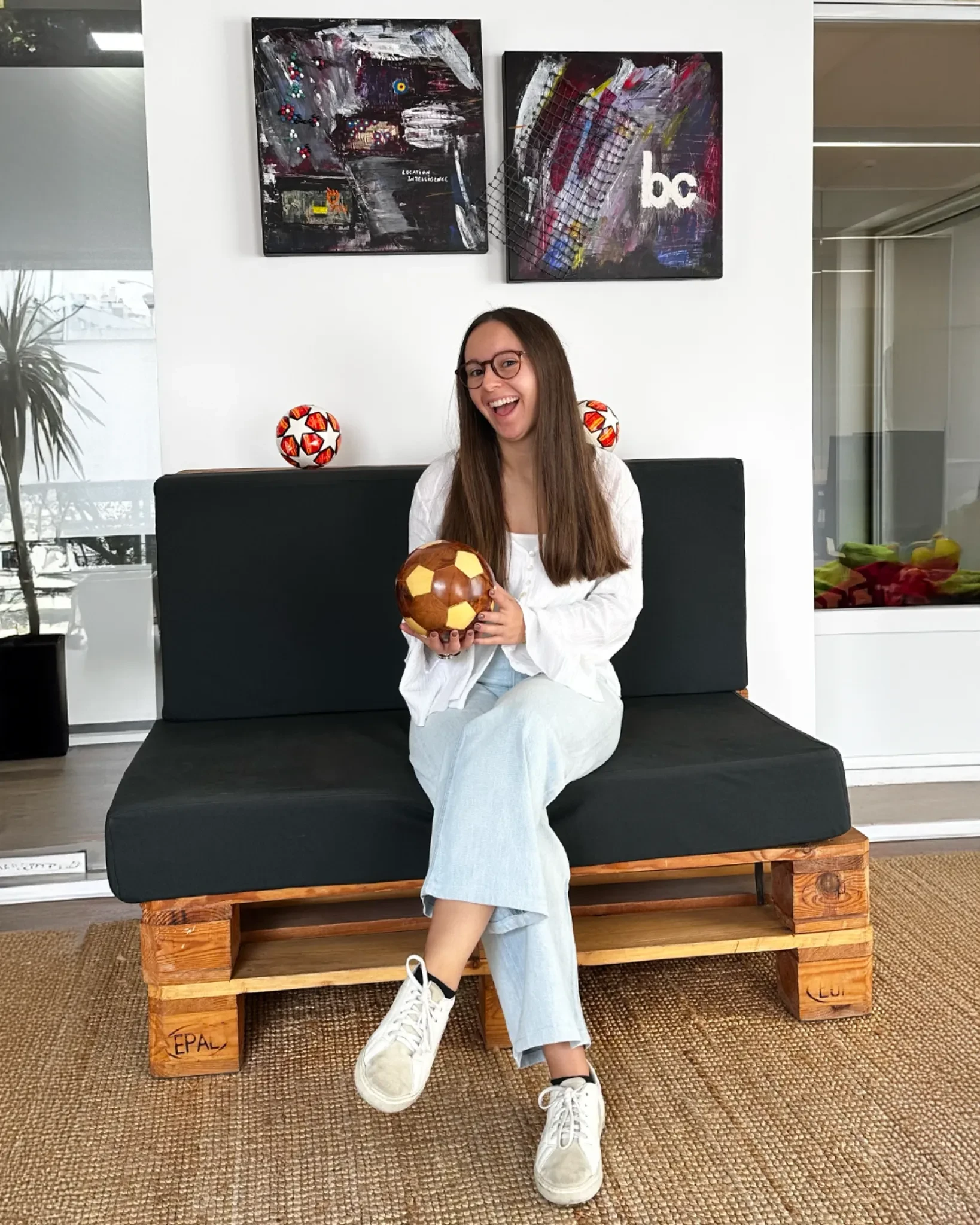 Mariana with long brown hair and glasses sitting on a black cushioned bench made from wooden pallets, smiling and holding a brown-and-gold football, with two c…
