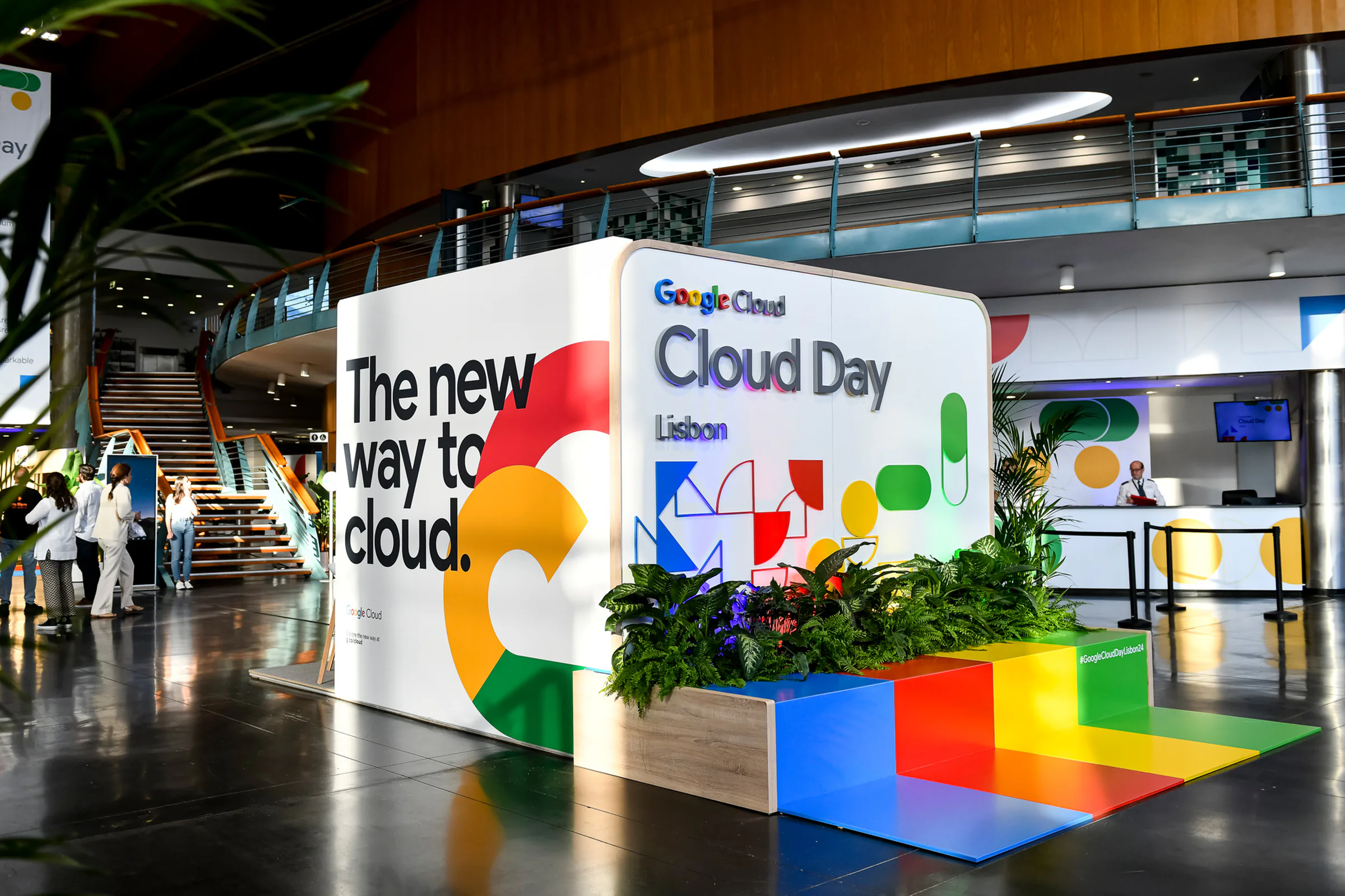 Large “Google Cloud Day Lisbon” display with the slogan “The new way to cloud,” surrounded by colorful branding elements and plants inside a modern venue.