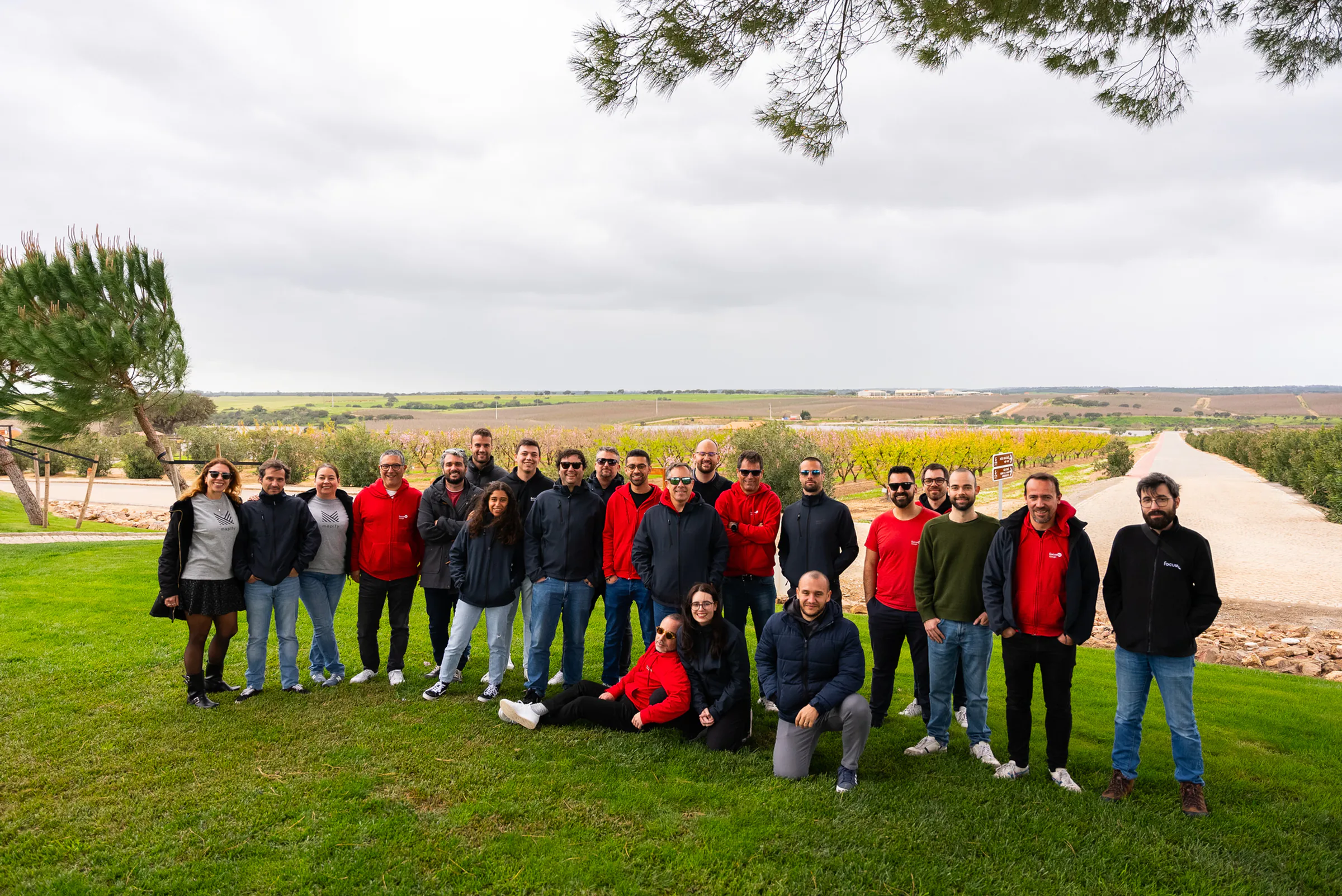 Large group of people posing together outdoors on a grassy area, with vineyards and open countryside in the background under a cloudy sky; some are standing wh…