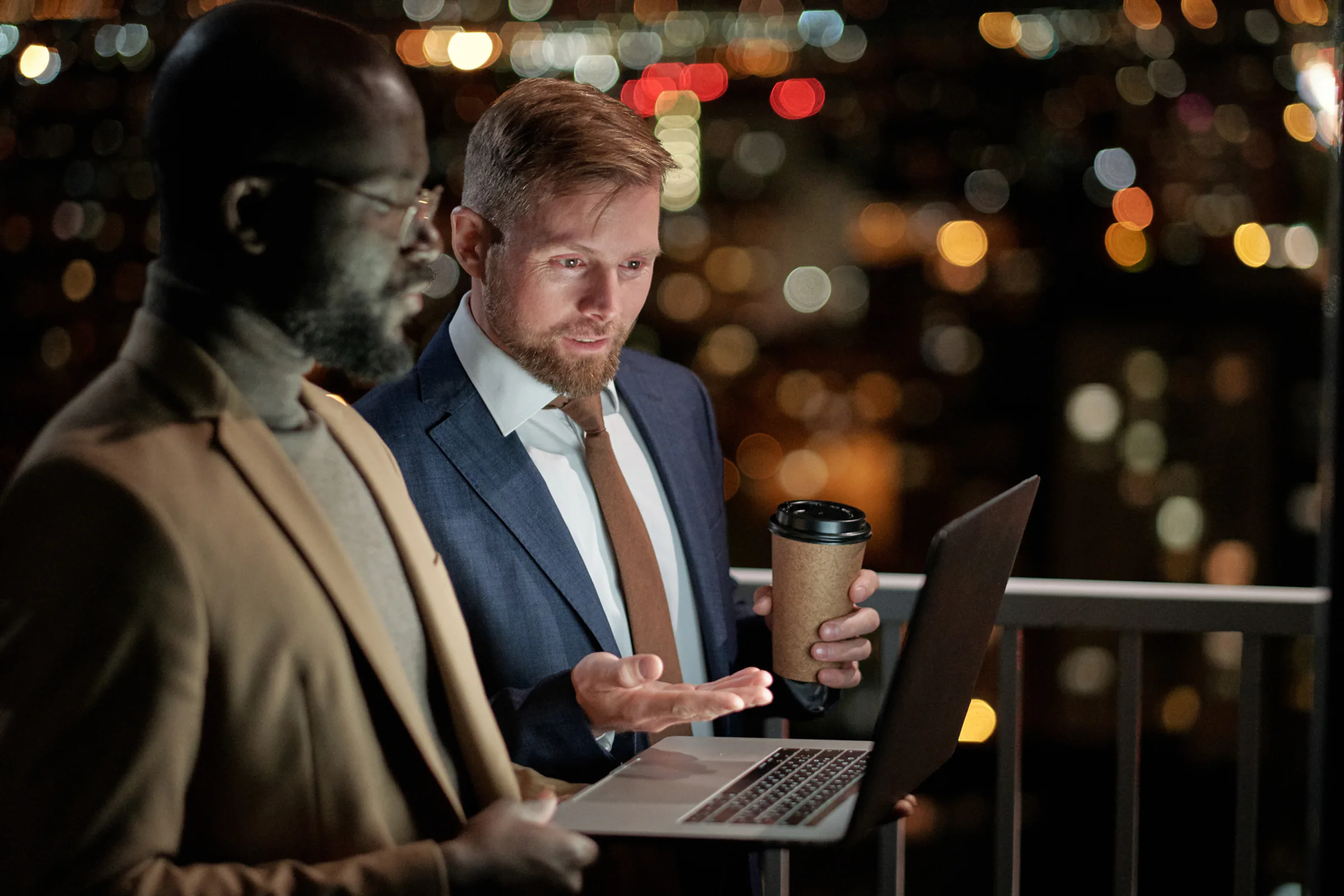 Two business professionals standing on a balcony at night reviewing a laptop, with city lights blurred in the background; one holds a takeaway coffee cup while…