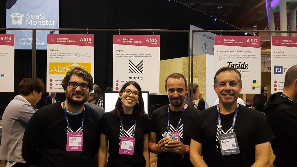 Event attendee wearing a red hoodie and Mapify T-shirt posing in front of an Algarve Tech Hub Summit backdrop with sponsor logos.
